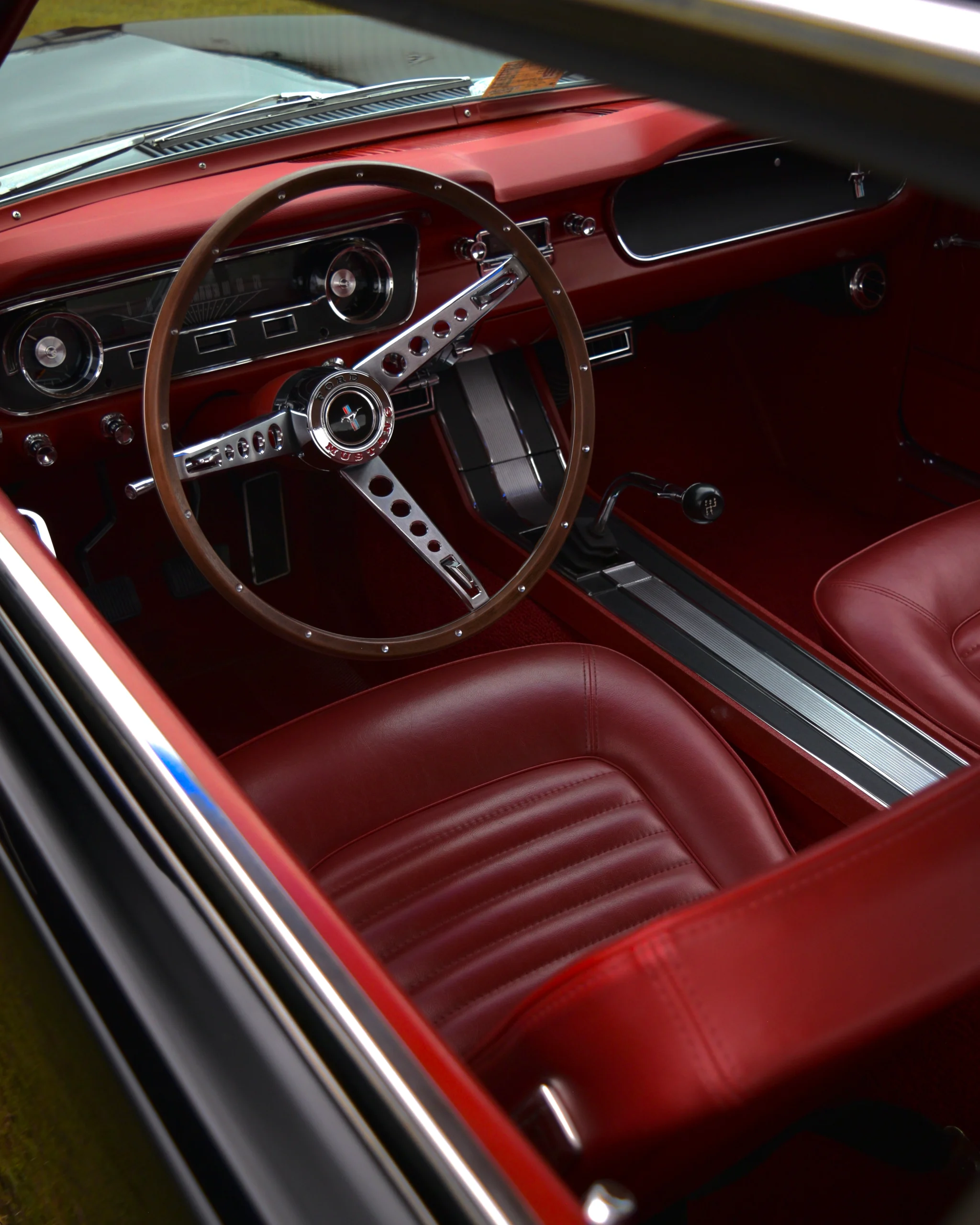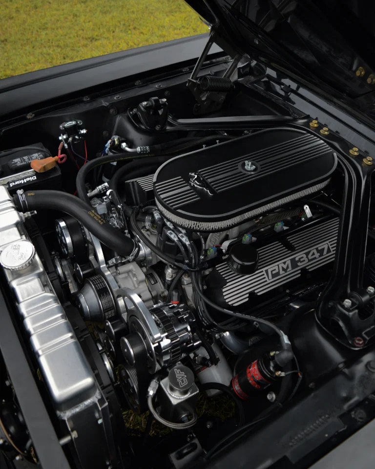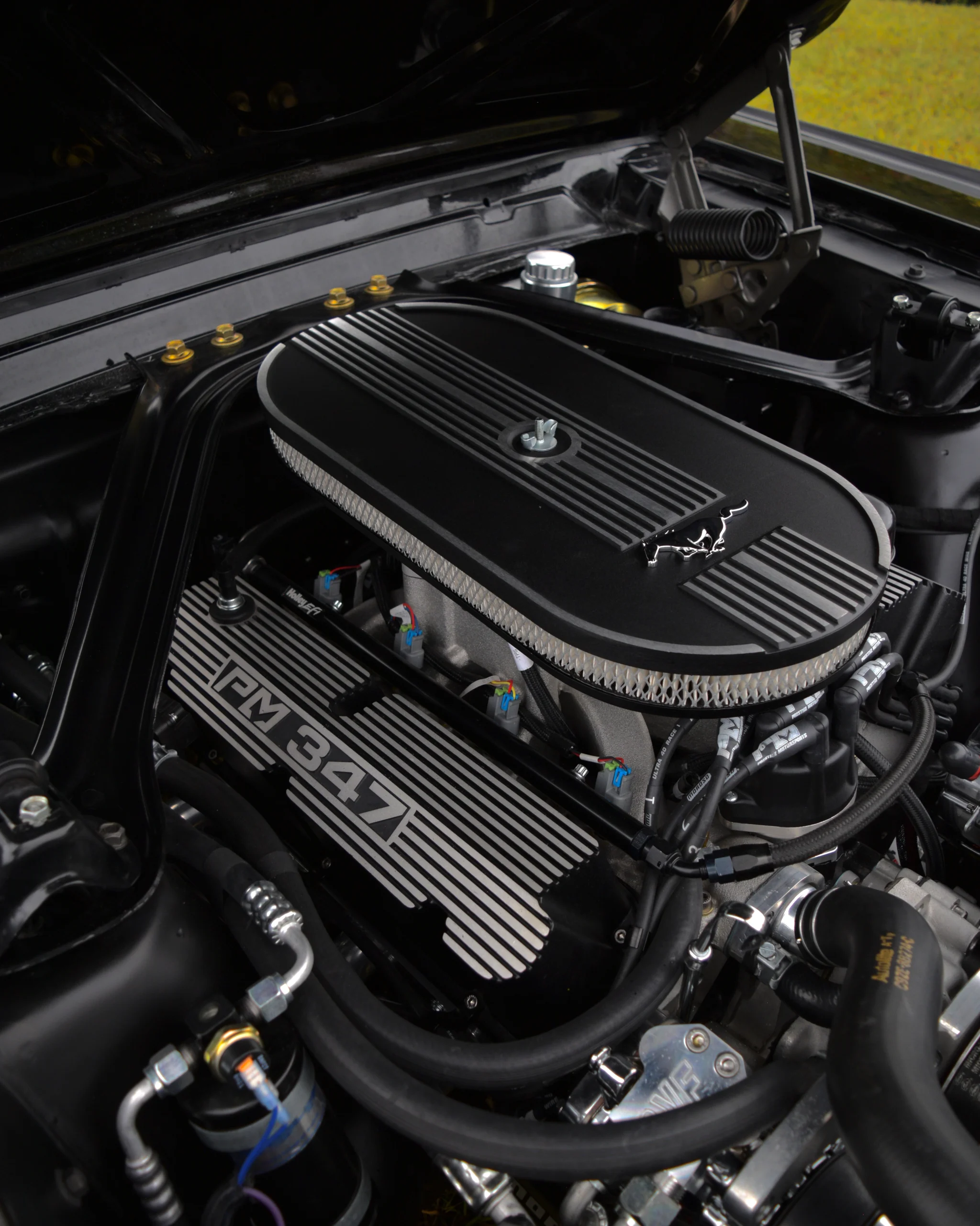 Among the many modifications that we made to this classic Pony car is providing a new heartbeat by dropping in a new Prestige Motors 347 cu. in. stroker motor and mated it to a Bowler built Tremec TKX 5-speed transmission. The engine has a sinister look thanks to a CVP Wraptor serpentine belt system, which also makes it much easier to maintain, and a DeWitts dual fan radiator is tasked with keeping that engine running cool! With the additional power this engine produces, we also improved braking by upgrading to 4-wheel disc brakes from Baer Brakes.