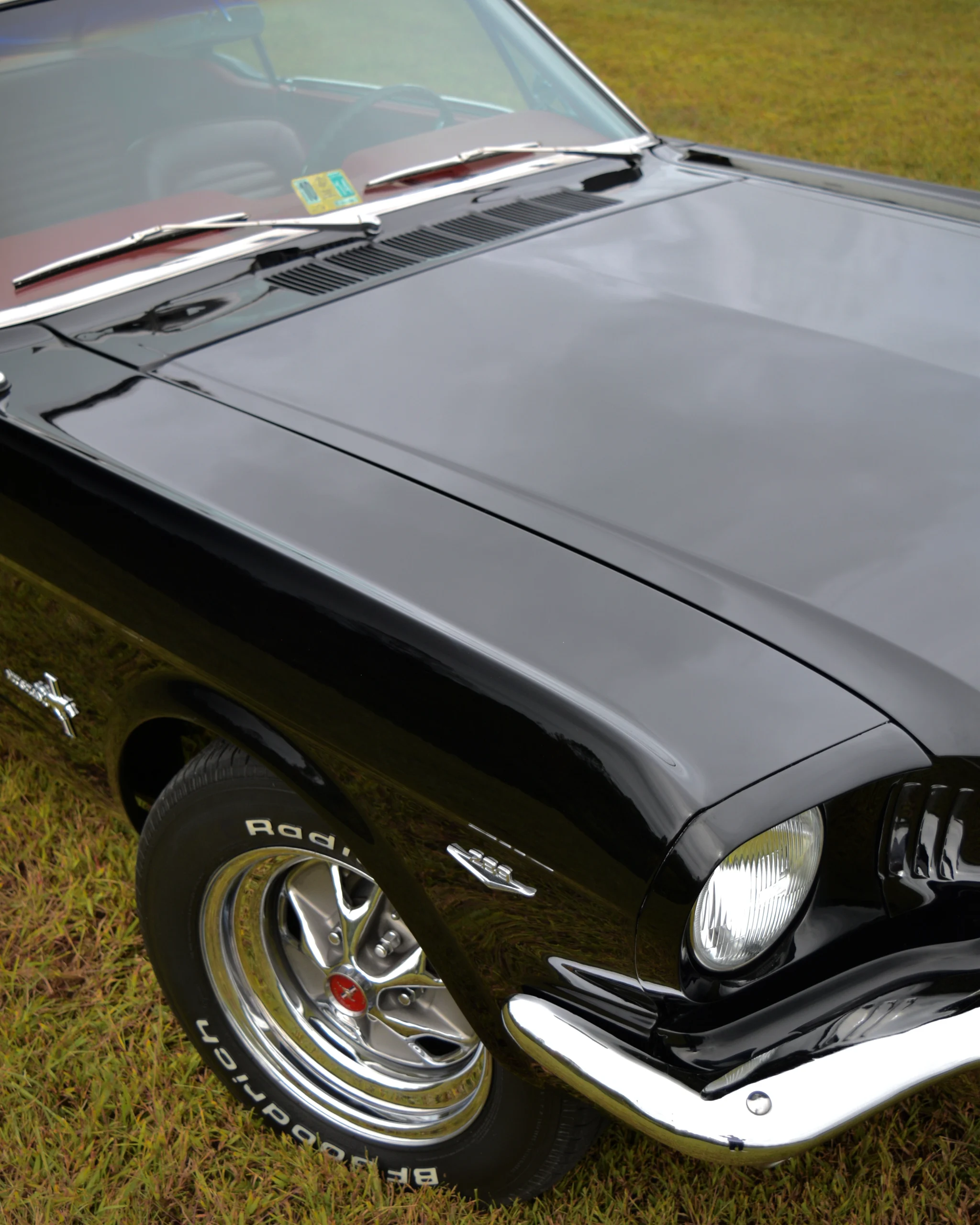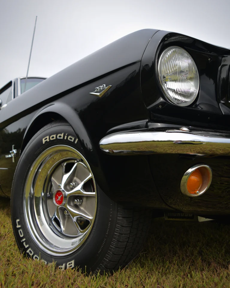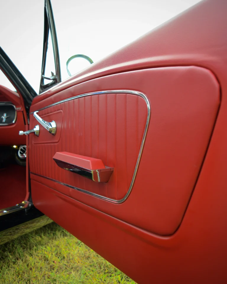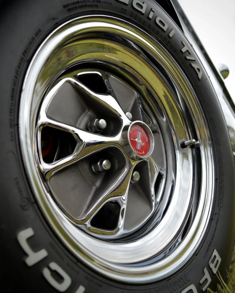 Among the many modifications that we made to this classic Pony car is providing a new heartbeat by dropping in a new Prestige Motors 347 cu. in. stroker motor and mated it to a Bowler built Tremec TKX 5-speed transmission. The engine has a sinister look thanks to a CVP Wraptor serpentine belt system, which also makes it much easier to maintain, and a DeWitts dual fan radiator is tasked with keeping that engine running cool! With the additional power this engine produces, we also improved braking by upgrading to 4-wheel disc brakes from Baer Brakes.